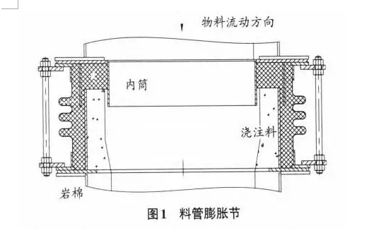 。由于料管上有起到通斷作用的鎖風(fēng)閥,熱風(fēng)被截?cái)啵锪鲜枪艿赖慕橘|(zhì)。因此,只要_膨脹節(jié)按照物料流動(dòng)方向安裝,內(nèi)部巖棉會(huì)受到很好的保護(hù),膨脹節(jié)很少失效。除此之外,還要注意內(nèi)筒下部跟澆注料之間的間隙控制,間隙太小會(huì)影響內(nèi)筒移動(dòng),引起膨脹節(jié)失效。間隙太大,對(duì)巖棉保護(hù)不利。